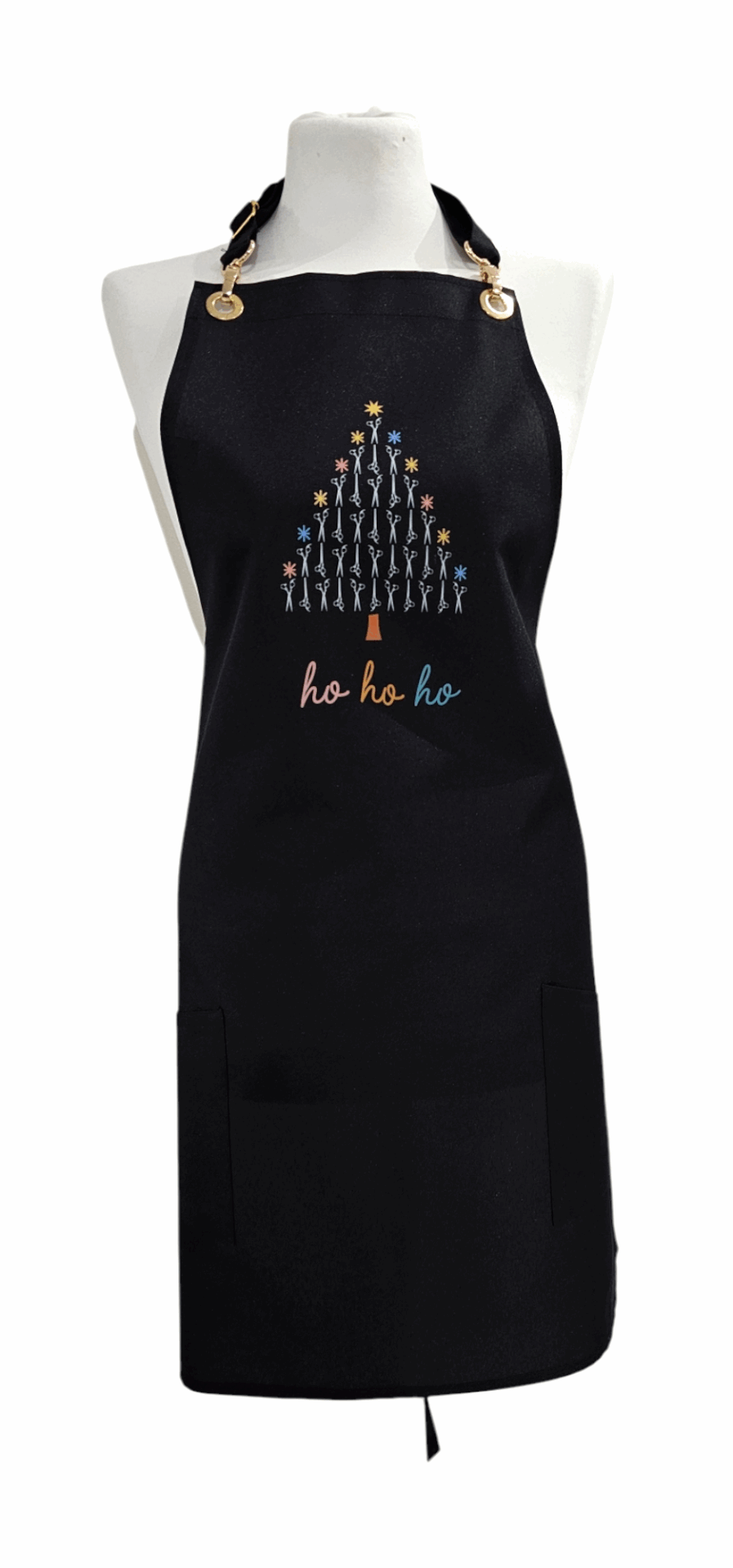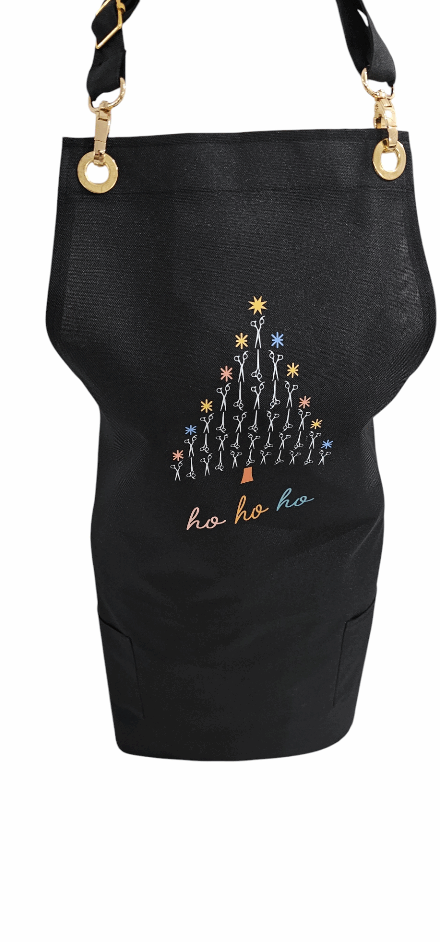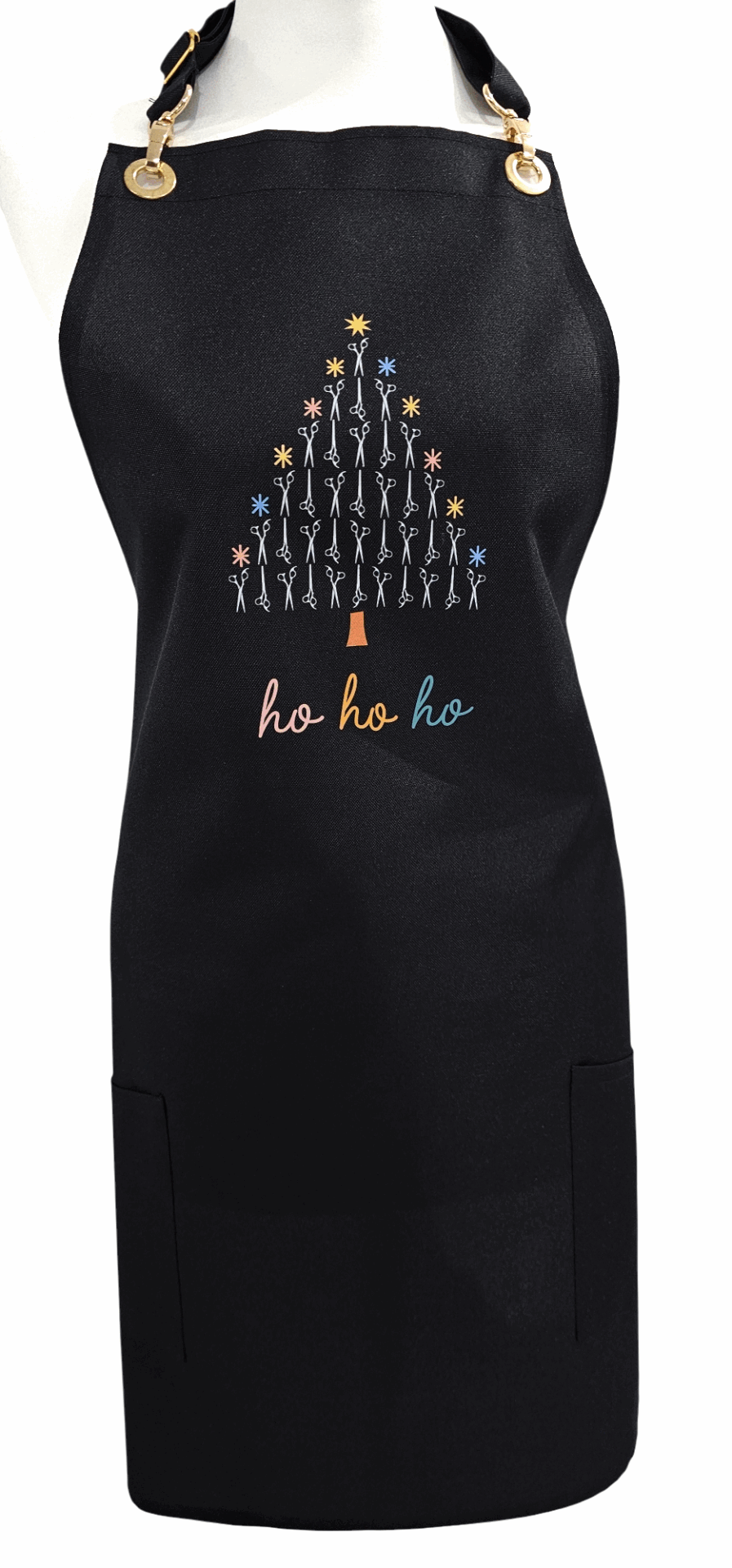 Fartuszek Klasyczny Ho Ho Ho #1 to doskonały wybór dla fryzjerów i stylistów, którzy pragną połączyć funkcjonalność z nutą świątecznej atmosfery. Ten elegancki fartuch fryzjerski w klasycznym czarnym kolorze, ozdobiony oryginalnym nadrukiem choinki z nożyczek, zapewnia nie tylko profesjonalny wygląd, ale także praktyczną ochronę przed produktami kosmetycznymi. Wykonany z wodoodpornej tkaniny, jest odporny na działanie farb oraz rozjaśniaczy, co czyni go niezbędnym elementem wyposażenia każdego salonu.