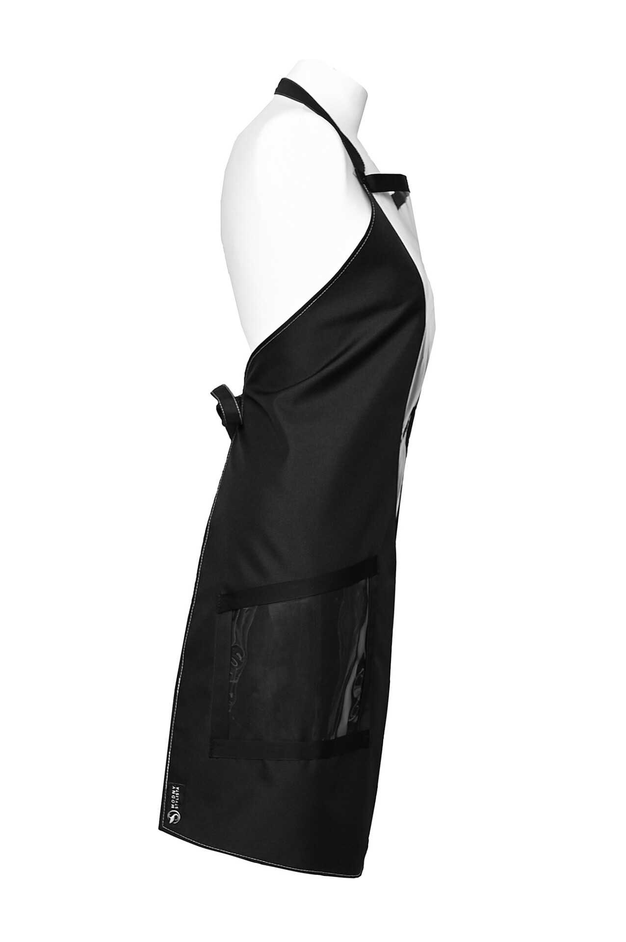 Fartuszek Venus wyróżnia się nie tylko nowoczesnym designem, ale także przemyślaną konstrukcją. Kieszenie wszyte w tkaninę z zabezpieczającą taśmą zapewniają funkcjonalność, umożliwiając przechowywanie niezbędnych narzędzi podczas pracy. Transparentne wstawki dodają lekkości i elegancji, a ozdobne wykończenie białym ściegiem podkreśla profesjonalizm.