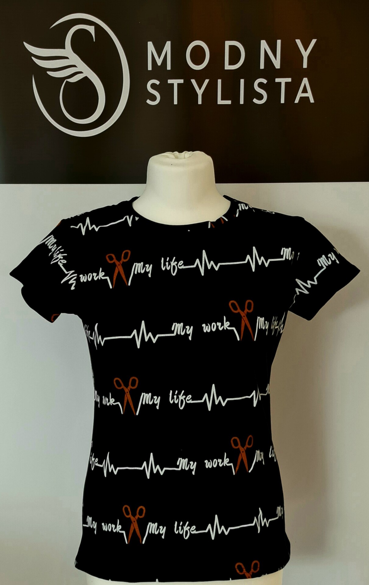 Koszulka z motywem „linii życia” to połączenie nowoczesnego wzornictwa z funkcjonalnością. Wzory inspirowane branżą fryzjerską dodają jej unikalnego charakteru, co pozwala wyróżnić się na tle innych. To nie tylko odzież robocza, ale także element stylizacji, który podkreśla profesjonalizm i indywidualność użytkowniczki. Dodatkowo, czarny kolor jest uniwersalny i elegancki, co sprawia, że koszulka pasuje do każdego stroju roboczego.