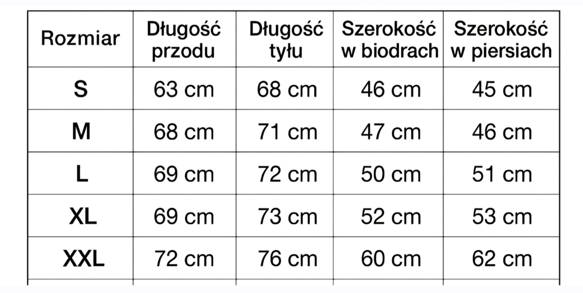 Rozmiar Długość przodu Długość tyłu Szerokość w biodrach Szerokość w piersiach