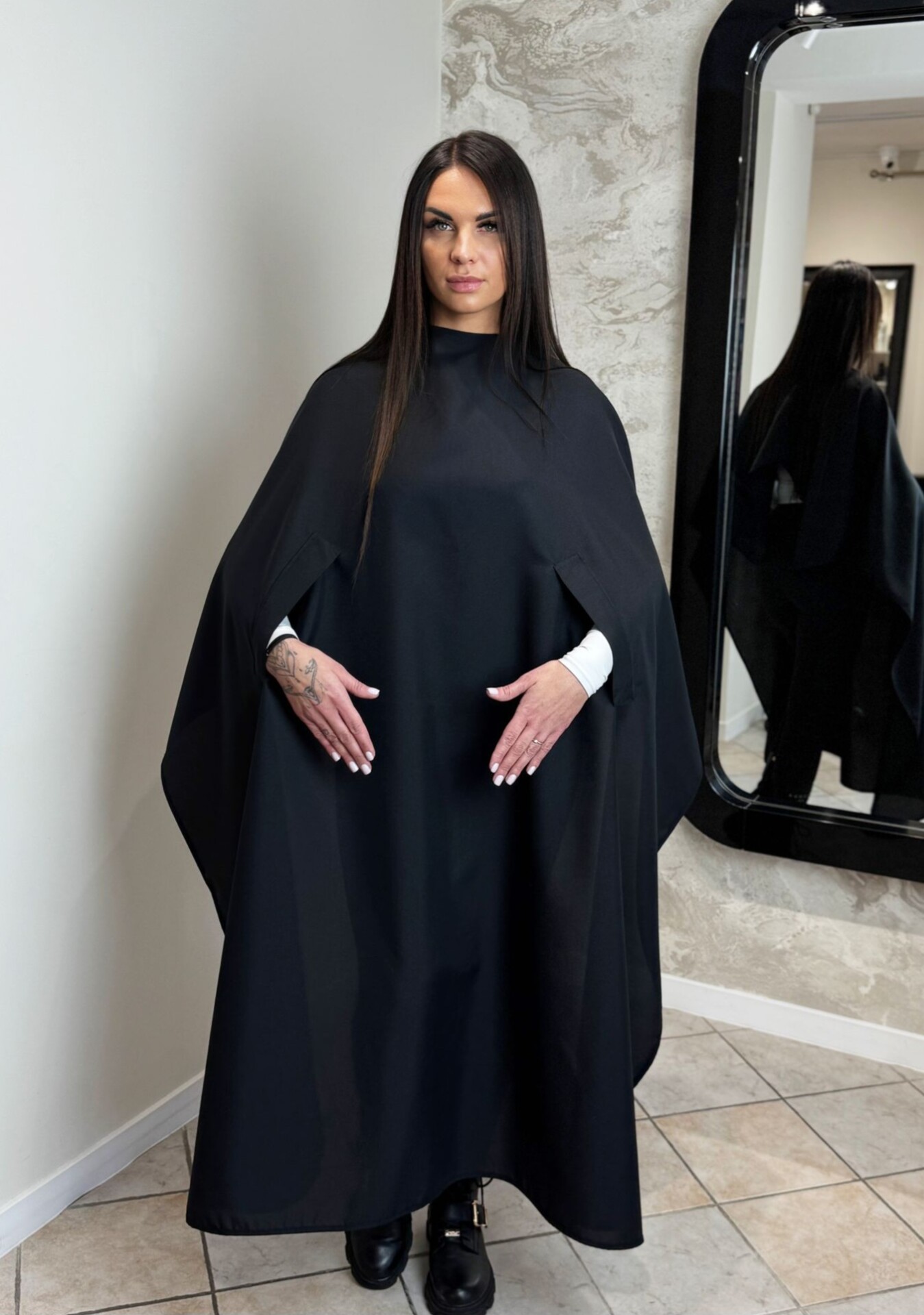 Peleryna Fryzjerska Długa z otworami na ręce 0125 to doskonałe rozwiązanie dla każdego salonu fryzjerskiego, który stawia na profesjonalizm i komfort klientów. Dzięki przemyślanemu projektowi, peleryna nie tylko chroni ubrania klienta przed zabrudzeniami, ale także umożliwia swobodne korzystanie z telefonu czy innych urządzeń podczas wizyty. Jej elegancki design i funkcjonalność sprawiają, że jest niezastąpiona w codziennej pracy fryzjera.